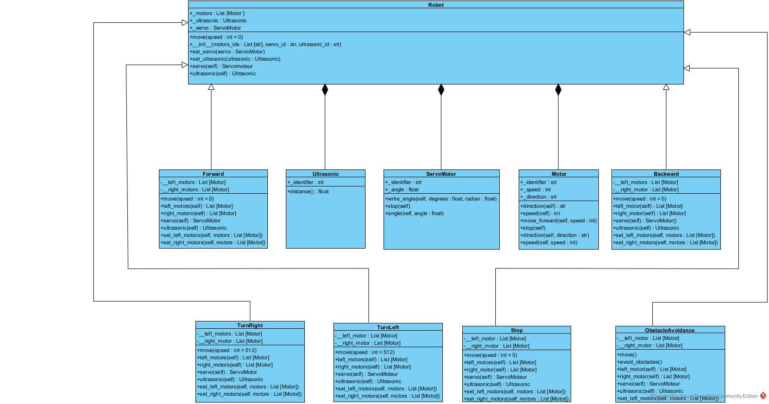 move()to be implemented in subclasses - Composition with hardware components (motors, servo, ultrasonic)