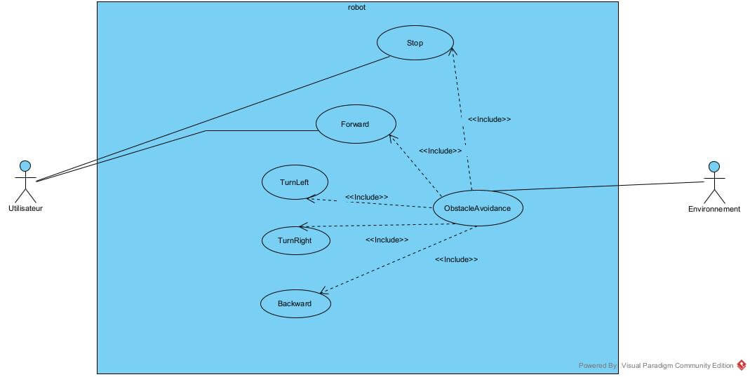 Actors: User: A human operator who initiates high-level movement commands (Forward, Stop). Environment: Represents external conditions, such as obstacles, detected by the robot. Use Cases: The main actions are Forward, Backward, TurnLeft, TurnRight, and Stop. The <Include> relationship is crucial: it means that the ObstacleAvoidance use case is systematically included in all movement actions. This ensures that the robot is constantly checking its environment to avoid collisions, making the system more robust and autonomous.