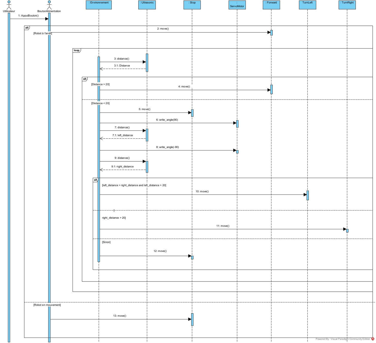 Detection loop: The robot enters a loop where it continuously requests the distance from its Ultrasonic sensor.