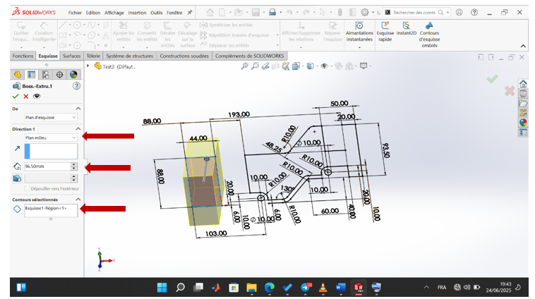 Use the extruded boss feature and extrude the selected region by 96.5 mm using the mid-plane option.