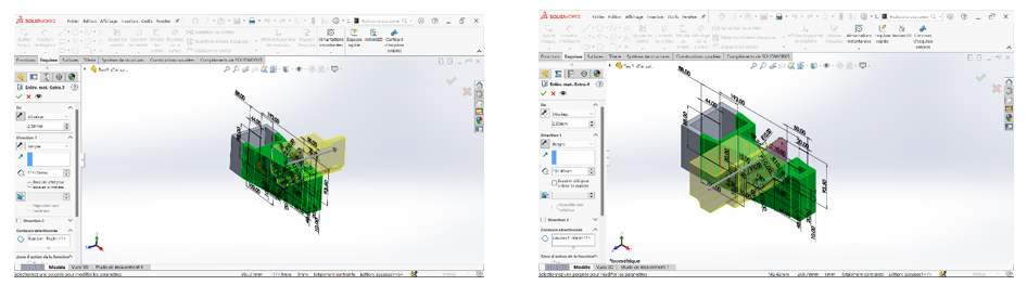 Using the first initial sketch, make an extruded cut on both sides of the region, leaving a 5 mm gap between them. Each cut is made with a 2.5 mm offset.